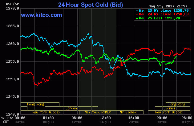 Chốt phiên giao dịch Thứ Năm (ngày 25/5), giá vàng giao tháng Sáu trên sàn Comex tại Sở Giao dịch New York Mercantile đảo chiều tăng nhẹ $3,30 (+0,3%) lên chốt tại $1.256,40/oz, đánh dấu phiên lên giá trở lại sau hai phiên suy liên tiếp. Tương tự, giá bạc giao tháng Bảy cũng tăng 7,6 cents (+0,4%) lên $17,193/oz.
