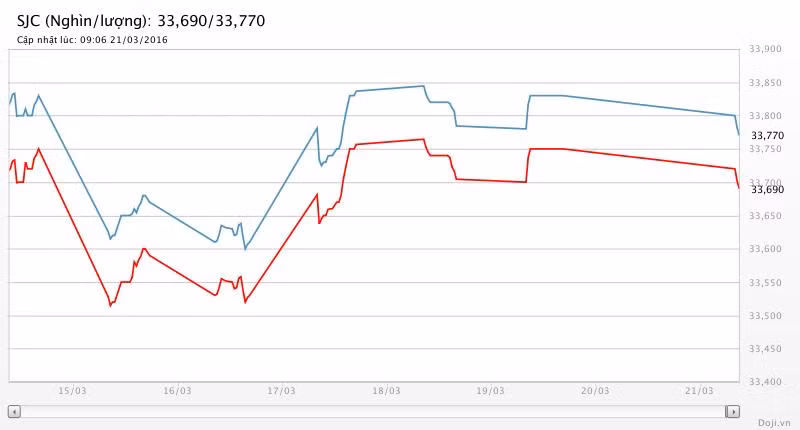 Tương tự, tại các đại lý Doji, giá vàng miếng SJC cũng được Tập đoàn điều chỉnh giảm 50 nghìn đồng về đứng ở 33,70 – 33,78 triệu đồng/lượng (MV-BR) đối với giao dịch lẻ; và đắt hơn 10 nghìn đồng chiều mua, đồng thời rẻ hơn 10 nghìn đồng chiều bán đối với giao dịch buôn ở thị trường Hà Nội. Với biểu giá này, doãng chênh lệch 2 chiều mua – bán vàng SJC tại Doji vẫn là 80 nghìn đồng/lượng.