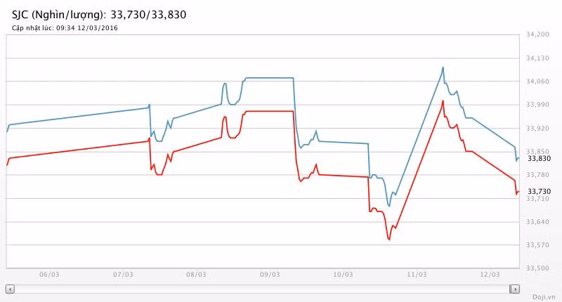 Tương tự, tại các đại lý Doji, giá vàng miếng SJC đã được Tập đoàn điều chỉnh giảm 120 nghìn đồng về đứng ở 33,73 – 33,83 triệu đồng/lượng (MV-BR) đối với giao dịch lẻ; và đắt hơn 10 nghìn đồng chiều mua, đồng thời rẻ hơn 10 nghìn đồng chiều bán đối với giao dịch buôn ở thị trường Hà Nội. Với biểu giá này, doãng chênh lệch 2 chiều mua – bán vàng SJC tại Doji vẫn là 100 nghìn đồng/lượng.