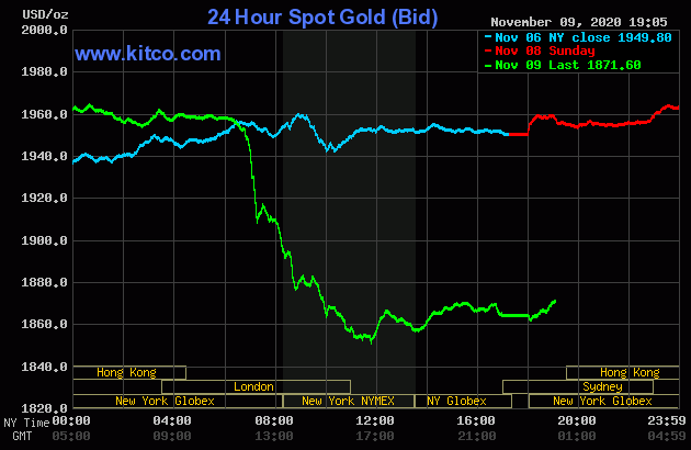 Trên Kitco.com, tại thời điểm 7h sáng ngày hôm nay 10/11 (theo giờ Việt Nam), giá vàng giao ngay được giao dịch quanh mức 1.870 USD/ounce, giảm khoảng 80 USD/ounce so với giá kết phiên giao dịch gần nhất. Giá vàng giao tháng 12/2020 trên sàn Comex New York được giao dịch ở mức 1.869 USD/ounce.