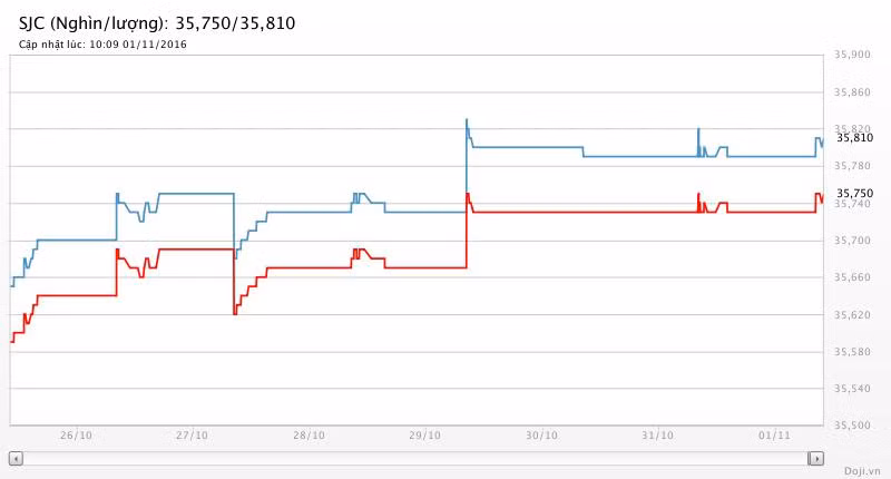 Tương tự, tại các đại lý của Doji, giá vàng miếng SJC cũng được Tập đoàn điều chỉnh nhích khẽ 20 nghìn đồng lên yết ở 35,75 – 35,81 triệu đồng/lượng (MV-BR) đối với giao dịch lẻ; và đắt hơn 10 nghìn đồng chiều mua, đồng thời rẻ hơn 10 nghìn đồng chiều bán đối với giao dịch buôn ở thị trường Hà Nội. Hiện, doãng chênh lệch 2 chiều mua - bán ở Doji là 60 nghìn đồng/lượng.