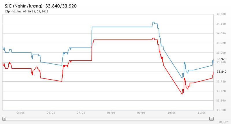 Tính đến thời 9h13’ sáng nay, Công ty TNHH Một thành viên Vàng bạc đá quý Sài Gòn (SJC) đang yết giá vàng miếng SJC ở 33,76 - 33,96 triệu đồng/lượng (MV-BR), tăng 80 nghìn đồng so với chốt phiên trước đó.