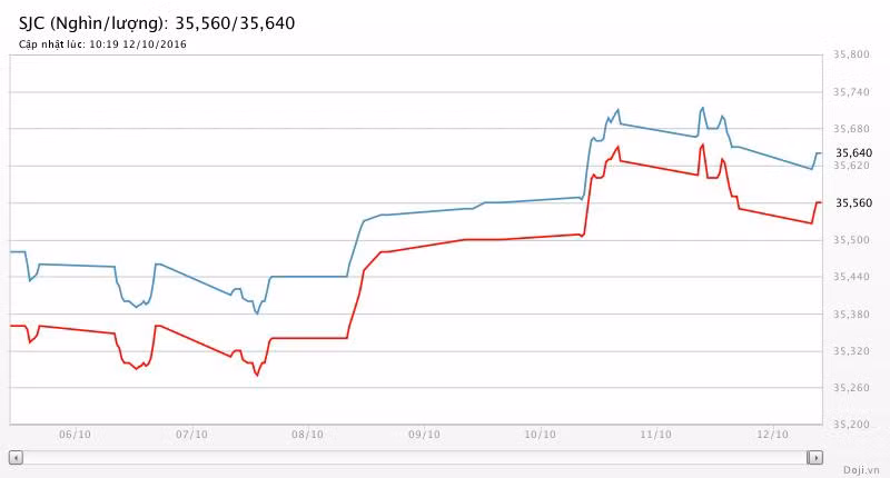 Tương tự, tại các đại lý của Doji, giá vàng miếng SJC cũng được Tập đoàn điều chỉnh tăng 40 nghìn đồng mỗi lượng chiều mua và 20 nghìn đồng mỗi lượng chiều bán lên 35,56 – 35,64 triệu đồng/lượng (MV-BR) đối với giao dịch lẻ; và đắt hơn 10 nghìn đồng chiều mua, đồng thời rẻ hơn 10 nghìn đồng chiều bán đối với giao dịch buôn ở thị trường Hà Nội. Hiện, doãng chênh lệch 2 chiều mua - bán ở Doji là 80 nghìn đồng/lượng.