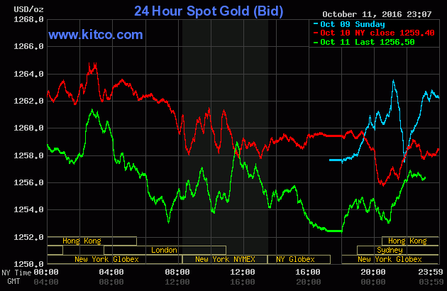 Chốt phiên giao dịch Thứ Ba (ngày 11/10), giá vàng giao tháng Mười hai trên sàn Comex tại Sở giao dịch New York Mercantile lại trượt $4,50 (-0,4%) xuống đóng cửa ở $1.255,90/oz, đánh dấu phiên suy thứ 7 trong 8 phiên gần nhất. Tương tự vàng, giá bạc giao Tháng Mười hai cũng lùi 15 cents (-0,9%) về chốt ở $17,509/oz.