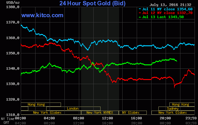Chốt phiên giao dịch Thứ Tư (ngày 13/07), giá vàng giao tháng Tám trên sàn Comex tại Sở giao dịch New York Mercantile đảo chiều tăng tốt $8,30 (+0,6%) lên đóng cửa ở $1.343,60/oz, đánh dấu phiên tăng điểm đầu tiên sau chuỗi rớt 5 phiên liên tiếp. Và đà tăng của kim loại quý này tiếp tục được cải thiện sau giờ giao dịch chính thức, khi Cục Dự trữ Liên bang Mỹ (FED) công bố cuốn Sổ Be, với nhiều thông tin hỗ trợ.