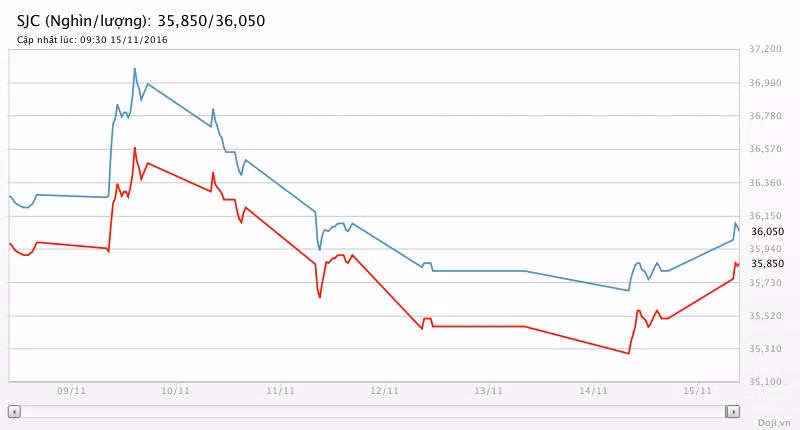 Cụ thể, đến thời điểm 9h37’ sáng nay, giá vàng miếng SJC của Công ty TNHH Một thành viên Vàng bạc đá quý Sài Gòn (SJC) đang đứng ở 35,85 – 36,10 triệu đồng/lượng (MV-BR), tăng 150 nghìn đồng chiều mua và 50 nghìn đồng chiều bán so với chốt phiên trước đó.