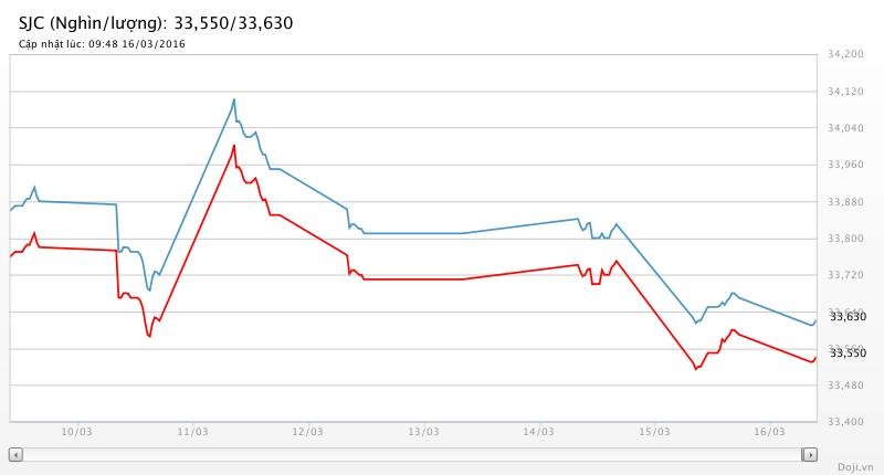 Tương tự, tại Doji, giá vàng miếng SJC lại được Tập đoàn điều chỉnh giảm 30 đồng cả chiều mua và bán về niêm yết ở 33,55 – 33,63 triệu đồng/lượng (MV-BR) đối với giao dịch lẻ; và đắt hơn 10 nghìn đồng chiều mua, đồng thời rẻ hơn 10 nghìn đồng chiều bán đối với giao dịch buôn ở thị trường Hà Nội. Hiện, doãng chênh lệch 2 chiều mua-bán ở Doji vẫn là 80 nghìn đồng/lượng.