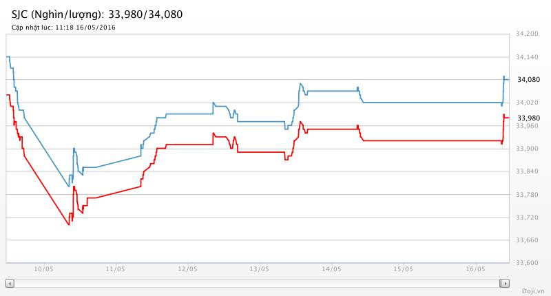 Tương tự, tại các đại lý của Doji, giá vàng miếng SJC cũng được Tập đoàn điều chỉnh tăng 60 nghìn đồng lên yết ở 33,98 – 34,08 triệu đồng/lượng (MV-BR) đối với giao dịch lẻ; và đắt hơn 10 nghìn đồng chiều mua, đồng thời rẻ hơn 10 nghìn đồng chiều bán đối với giao dịch buôn ở thị trường Hà Nội. Hiện, doãng chênh lệch 2 chiều mua-bán ở Doji là 100 nghìn đồng/lượng.