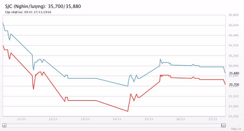 Tương tự, tại các đại lý của Doji, giá vàng miếng SJC cũng được Tập đoàn điều chỉnh giảm 80 nghìn đồng chiều mua và 100 nghìn đồng chiều bán về yết ở 35,70 – 35,88 triệu đồng/lượng (MV-BR) đối với giao dịch lẻ; và đắt hơn 10 nghìn đồng chiều mua, đồng thời rẻ hơn 10 nghìn đồng chiều bán đối với giao dịch buôn ở thị trường Hà Nội. Hiện, doãng chênh lệch 2 chiều mua - bán ở Doji là 180 nghìn đồng/lượng.