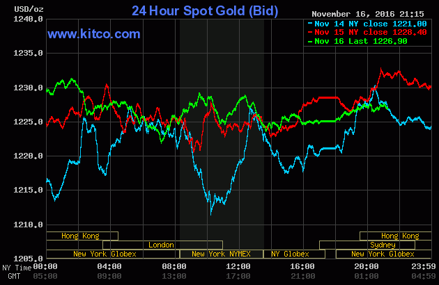Chốt phiên giao dịch Thứ Tư (ngày 16/11), giá vàng giao tháng Mười hai trên sàn Comex tại Sở giao dịch New York Mercantile khẽ trôi 60 cents (-0,1%) về đóng cửa ở $1.223,90/oz; Dù trước đó trong phiên, nhiều thời điểm, vàng đã chạm ngưỡng $1.233/oz.