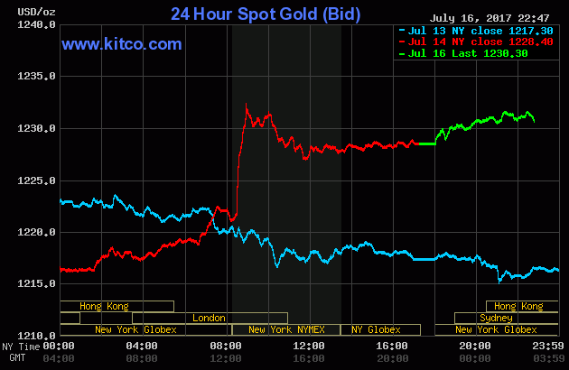 Chốt phiên giao dịch cuối tuần trước (Thứ Sáu ngày 14/7), giá vàng giao tháng Tám trên sàn Comex tại Sở Giao dịch New York Mercantile tăng $10,20 (+0,8%) lên chốt tại $1.227,50/oz – đoạt đỉnh kể từ ngày 30/6 và cũng là phiên tăng mạnh nhất kể từ ngày 6/6, căn cứ theo dữ liệu của FactSet. Tính chung cả tuần, giá kim loại quý này tăng tổng cộng 1,5% - là tuần tăng đầu tiên sau chuỗi 5 tuần suy liên tiếp.