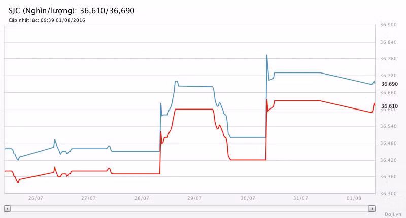 Tương tự, tại các đại lý của Doji, giá vàng miếng SJC cũng được Tập đoàn điều chỉnh giảm 20 nghìn đồng chiều mua và 40 nghìn đồng chiều bán về yết ở 36,61 – 36,69 triệu đồng/lượng (MV-BR) đối với giao dịch lẻ; và đắt hơn 10 nghìn đồng chiều mua, đồng thời rẻ hơn 10 nghìn đồng chiều bán đối với giao dịch buôn ở thị trường Hà Nội. Hiện, doãng chênh lệch 2 chiều mua - bán ở Doji là 80 nghìn đồng/lượng.
