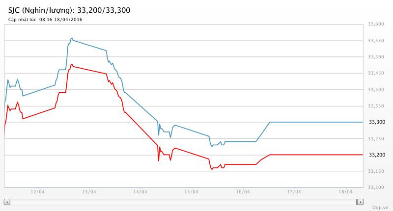 Trong khi, tại các đại lý Doji, giá vàng miếng SJC cũng được Tập đoàn giữ nguyên ở 33,20 – 33,30 triệu đồng/lượng (MV-BR) đối với giao dịch lẻ; và đắt hơn 10 nghìn đồng chiều mua, đồng thời rẻ hơn 10 nghìn đồng chiều bán đối với giao dịch buôn ở thị trường Hà Nội. Với biểu giá này, doãng chênh lệch 2 chiều mua – bán vàng SJC tại Doji hiện là 100 nghìn đồng/lượng.