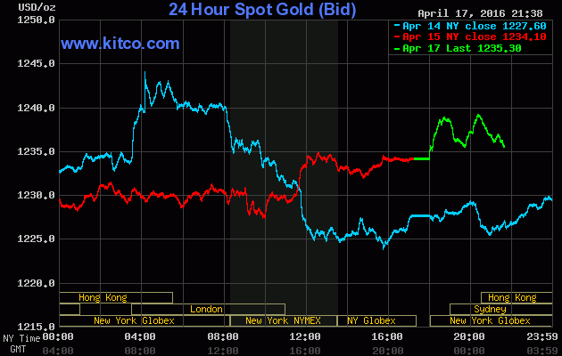 Chốt phiên giao dịch cuối tuần trước (Thứ Sáu ngày 15/04), giá vàng giao tháng Sáu trên sàn Comex tại Sở giao dịch New York Mercantile đảo chiều leo mạnh $8,10 (+0,7%) lên đóng cửa ở $1.234,60/oz. Dù vậy, đây vẫn là tuần giảm đầu tiên của kim loại quý này trong 3 tuần, khi mất 0,6%.