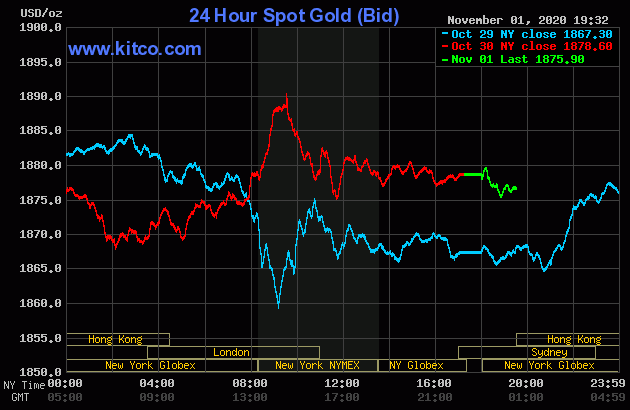 Trên Kitco.com, tại thời điểm 7h sáng ngày hôm nay 2/11 (theo giờ Việt Nam), giá vàng giao ngay được giao dịch ở mức 1.875 USD/ounce, giảm khoảng 3 USD/ounce so với giá kết phiên giao dịch gần nhất. Giá vàng giao tháng 12/2020 trên sàn Comex New York giao dịch ở mức 1.876 USD/ounce.