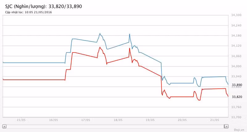 Tương tự, tại các đại lý của Doji, giá vàng miếng SJC cũng được Tập đoàn điều chỉnh giảm 60 nghìn đồng mỗi chiều về yết ở 33,82 – 33,89 triệu đồng/lượng (MV-BR) đối với giao dịch lẻ; và đắt hơn 10 nghìn đồng chiều mua, đồng thời rẻ hơn 10 nghìn đồng chiều bán đối với giao dịch buôn ở thị trường Hà Nội. Hiện, doãng chênh lệch 2 chiều mua - bán ở Doji là 70 nghìn đồng/lượng.