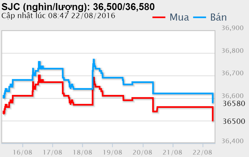 Tương tự, tại các đại lý của Doji, giá vàng miếng SJC cũng được Tập đoàn điều chỉnh giảm 60 nghìn đồng chiều mua và 40 nghìn đồng chiều bán về yết ở 36,50 – 36,58 triệu đồng/lượng (MV-BR) đối với giao dịch lẻ; và đắt hơn 10 nghìn đồng chiều mua, đồng thời rẻ hơn 10 nghìn đồng chiều bán đối với giao dịch buôn ở thị trường Hà Nội. Hiện, doãng chênh lệch 2 chiều mua - bán ở Doji là 80 nghìn đồng/lượng.