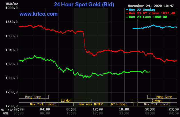 Trên Kitco.com, tại thời điểm 7h30 sáng ngày hôm nay 25/11 (theo giờ Việt Nam), giá vàng giao ngay được giao dịch ở mức 1.807 USD/ounce, giảm 30 USD so với giá kết phiên giao dịch gần nhất. Giá vàng giao tháng 12/2021 trên sàn Comex New York được giao dịch ở mức 1.828,6 USD/ounce.