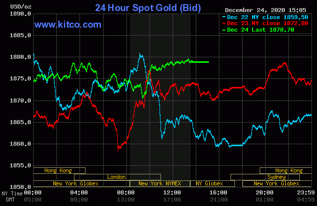 Trên Kitco.com, tại thời điểm 7h sáng ngày hôm nay 24/12 (theo giờ Việt Nam), giá vàng giao ngay được niêm yết ở mức 1.878,7 USD/ounce, tăng 6 USD so với giá kết phiên giao dịch gần nhất. Giá vàng giao tháng 12/2021 trên sàn Comex New York được giao dịch ở mức 1.900 USD/ounce.