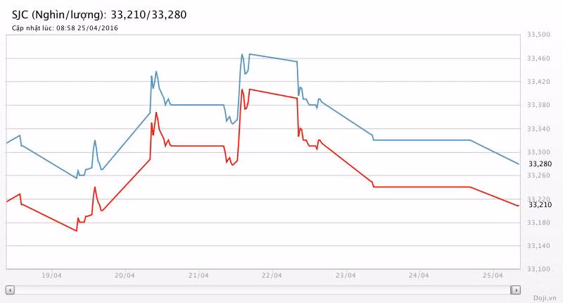Tương tự, tại các đại lý Doji, giá vàng miếng SJC cũng được Tập đoàn điều chỉnh giảm 30 nghìn đồng chiều mua và 40 nghìn đồng chiều bán xuống đứng ở 33,21 – 33,28 triệu đồng/lượng (MV-BR) đối với giao dịch lẻ; và đắt hơn 10 nghìn đồng chiều mua, đồng thời rẻ hơn 10 nghìn đồng chiều bán đối với giao dịch buôn ở thị trường Hà Nội. Với biểu giá này, doãng chênh lệch 2 chiều mua – bán vàng SJC tại Doji hiện là 70 nghìn đồng/lượng.