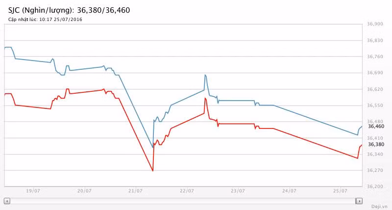 Tương tự, tại các đại lý của Doji, giá vàng miếng SJC cũng được Tập đoàn điều chỉnh giảm 70 nghìn đồng chiều mua và 90 nghìn đồng chiều bán về yết ở 36,38 – 36,46 triệu đồng/lượng (MV-BR) đối với giao dịch lẻ; và đắt hơn 10 nghìn đồng chiều mua, đồng thời rẻ hơn 10 nghìn đồng chiều bán đối với giao dịch buôn ở thị trường Hà Nội. Hiện, doãng chênh lệch 2 chiều mua - bán ở Doji là 80 nghìn đồng/lượng.