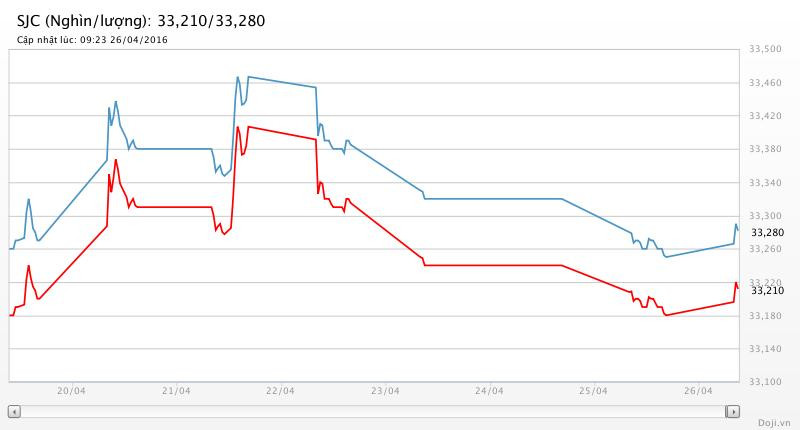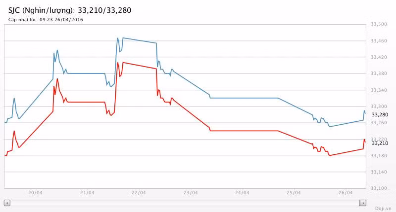 Tương tự, tại các đại lý Doji, giá vàng miếng SJC cũng được Tập đoàn điều chỉnh tăng 30 nghìn đồng mỗi chiều lên đứng ở 33,21 – 33,28 triệu đồng/lượng (MV-BR) đối với giao dịch lẻ; và đắt hơn 10 nghìn đồng chiều mua, đồng thời rẻ hơn 10 nghìn đồng chiều bán đối với giao dịch buôn ở thị trường Hà Nội. Với biểu giá này, doãng chênh lệch 2 chiều mua – bán vàng SJC tại Doji hiện là 70 nghìn đồng/lượng.