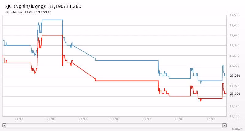 Trong khi, tại các đại lý của Doji, giá vàng miếng SJC lại được Tập đoàn điều chỉnh tăng nhẹ 20 nghìn đồng mỗi chiều lên yết ở 33,19 – 33,26 triệu đồng/lượng (MV-BR) đối với giao dịch lẻ; và đắt hơn 10 nghìn đồng chiều mua, đồng thời rẻ hơn 10 nghìn đồng chiều bán đối với giao dịch buôn ở thị trường Hà Nội. Hiện, doãng chênh lệch 2 chiều mua-bán ở Doji là 70 nghìn đồng/lượng.