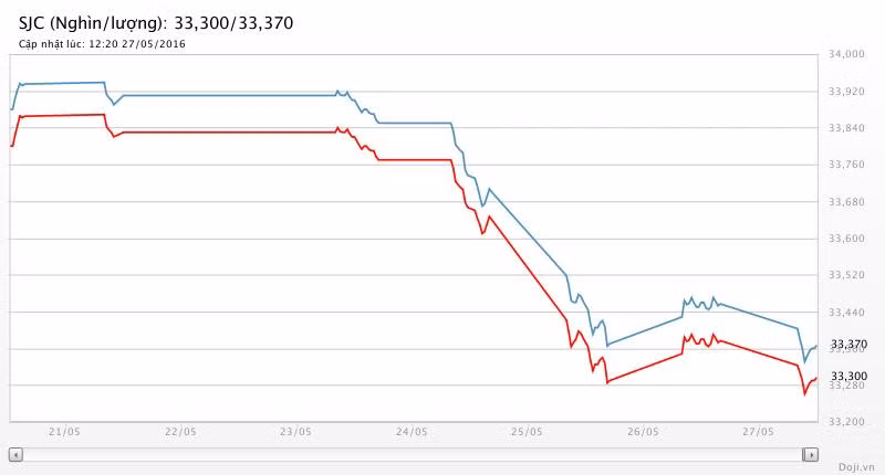 Tương tự, tại các đại lý của Doji, giá vàng miếng SJC cũng được Tập đoàn điều chỉnh lùi 80 nghìn đồng chiều mua và 90 nghìn đồng chiều bán xuống yết ở 33,30 – 33,37 triệu đồng/lượng (MV-BR) đối với giao dịch lẻ; và đắt hơn 10 nghìn đồng chiều mua, đồng thời rẻ hơn 10 nghìn đồng chiều bán đối với giao dịch buôn ở thị trường Hà Nội. Hiện, doãng chênh lệch 2 chiều mua - bán ở Doji là 70 nghìn đồng/lượng.