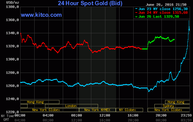 Với kết quả Brexit, chốt phiên giao dịch cuối tuần trước (Thứ Sáu ngày 24/06), giá vàng giao tháng Tám trên sàn Comex tại Sở giao dịch New York Mercantile bật “sốc” $59,30 (+4,7%) lên đóng cửa ở $1.322,40/oz, lập đỉnh kể từ ngày 11/7/2014 và cũng ghi nhận phiên tăng mạnh nhất kể từ tháng 9/2013 – theo số liệu của FactSet. Tính chung cả tuần, giá vàng tăng tổng cộng 2,2%.
