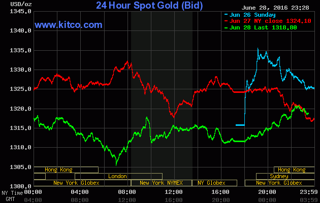 Chốt phiên giao dịch Thứ Ba (ngày 28/06), giá vàng giao tháng Tám trên sàn Comex tại Sở giao dịch New York Mercantile đảo chiều trôi sâu $6,80 (-0,5%) xuống đóng cửa ở $1.317,90/oz; Trước đó vàng đã chốt đỉnh ở $1.324,70/oz trong hôm Thứ Hai – cao nhất kể từ ngày 11/7/2014.