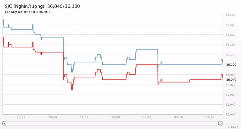 Trong khi, tại các đại lý của Doji, giá vàng miếng SJC cũng được Tập đoàn điều chỉnh nhích không đáng kể 10 nghìn đồng mỗi lượng lên yết ở 36,05 – 36,11 triệu đồng/lượng (MV-BR) đối với giao dịch lẻ; và đắt hơn 10 nghìn đồng chiều mua, đồng thời rẻ hơn 10 nghìn đồng chiều bán đối với giao dịch buôn ở thị trường Hà Nội. Hiện, doãng chênh lệch 2 chiều mua - bán ở Doji là 60 nghìn đồng/lượng.