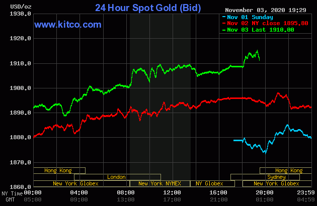 Trên Kitco.com, tại thời điểm 7h30 sáng ngày hôm nay 4/11 (theo giờ Việt Nam), giá vàng giao ngay được giao dịch ở mức 1.910 USD/ounce, tăng khoảng 15 USD/ounce so với giá kết phiên giao dịch gần nhất. Giá vàng giao tháng 12/2020 trên sàn Comex New York giao dịch ở mức 1.914,5 USD/ounce.