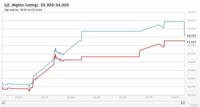 Trong khi, tại các đại lý của Doji, giá vàng miếng SJC dù chỉ được Tập đoàn điều chỉnh hạ nhẹ 20 nghìn đồng chiều mua nhưng ở chiều bán, mức điều chỉnh lại lên tới -220 nghìn đồng mỗi lượng, về yết ở 33,93 – 34,03 triệu đồng/lượng (MV-BR) đối với giao dịch lẻ; và đắt hơn 10 nghìn đồng chiều mua, đồng thời rẻ hơn 10 nghìn đồng chiều bán đối với giao dịch buôn ở thị trường Hà Nội. Hiện, doãng chênh lệch 2 chiều mua-bán ở Doji là 100 nghìn đồng/lượng.