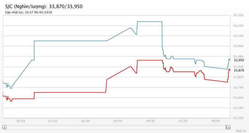 Tương tự, tại các đại lý của Doji, giá vàng miếng SJC cũng được Tập đoàn điều chỉnh tăng 70 nghìn đồng lên yết ở 33,87 – 33,95 triệu đồng/lượng (MV-BR) đối với giao dịch lẻ; và đắt hơn 10 nghìn đồng chiều mua, đồng thời rẻ hơn 10 nghìn đồng chiều bán đối với giao dịch buôn ở thị trường Hà Nội. Hiện, doãng chênh lệch 2 chiều mua-bán ở Doji là 80 nghìn đồng/lượng.