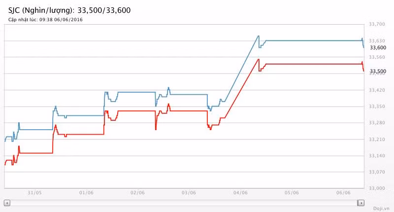 Tương tự, tại các đại lý của Doji, giá vàng miếng SJC cũng được Tập đoàn điều chỉnh hạ 30 nghìn đồng mỗi chiều xuống yết ở 33,50 – 33,60 triệu đồng/lượng (MV-BR) đối với giao dịch lẻ; và đắt hơn 10 nghìn đồng chiều mua, đồng thời rẻ hơn 10 nghìn đồng chiều bán đối với giao dịch buôn ở thị trường Hà Nội. Hiện, doãng chênh lệch 2 chiều mua - bán ở Doji là 100 nghìn đồng/lượng.