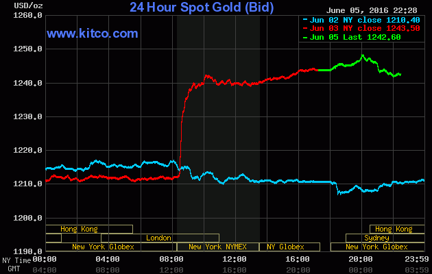 Chốt phiên giao dịch cuối tuần trước (Thứ Sáu ngày 04/06), giá vàng giao tháng Tám trên sàn Comex tại Sở giao dịch New York Mercantile bật “sốc” $30,30 (+2,5%) lên đóng cửa ở $1.242,90/oz, tương ứng mức tăng 2,2% trong cả tuần. Tương tự, giá bạc giao Tháng Bảy cũng vươn 2,4%, lên đứng ở $16,35/oz.