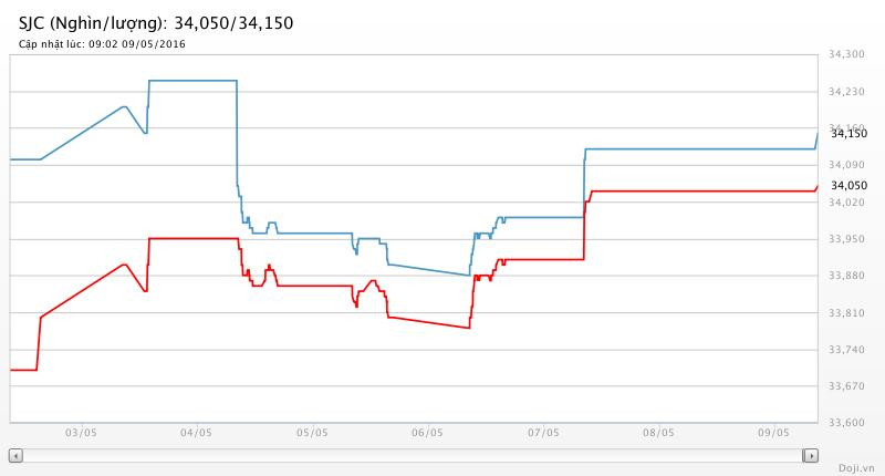 Tương tự, tại các đại lý Doji, giá vàng miếng SJC cũng vẫn được Tập đoàn điều chỉnh tăng 130 nghìn đồng lên niêm yết ở 34,05 – 34,15 triệu đồng/lượng (MV-BR) đối với giao dịch lẻ; và đắt hơn 10 nghìn đồng chiều mua, đồng thời rẻ hơn 10 nghìn đồng chiều bán đối với giao dịch buôn ở thị trường Hà Nội. Với biểu giá này, doãng chênh lệch 2 chiều mua – bán vàng SJC tại Doji hiện ở mức 80 nghìn đồng/lượng.