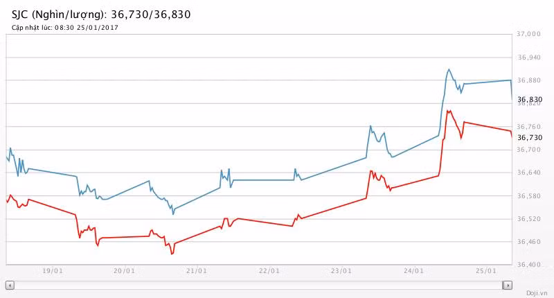 Tương tự, tại các đại lý của Doji, giá vàng miếng SJC cũng được tập đoàn này điều chỉnh giảm 40 nghìn đồng mỗi chiều về 36,73 – 36,83 triệu đồng/lượng (MV-BR) đối với giao dịch lẻ; và đắt hơn 10 nghìn đồng chiều mua, đồng thời rẻ hơn 10 nghìn đồng chiều bán đối với giao dịch buôn ở thị trường Hà Nội. Hiện, doãng chênh lệch 2 chiều mua - bán ở Doji là 100 nghìn đồng/lượng.