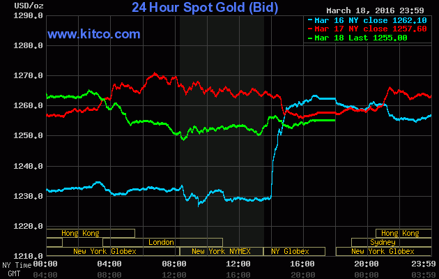 Chốt phiên giao dịch Thứ Sáu (ngày 18/03), giá vàng giao tháng Tư trên sàn Comex tại Sở giao dịch New York Mercantile đảo chiều giảm mạnh $10,70 (-0,9%) xuống đóng cửa ở $1.254,30/oz; Trước đó, phiên Thứ Năm, vàng đã leo sốc tới 2,9%. Tính chung cả tuần, vàng giảm 0,4% - đánh dấu tuần mất giá thứ 4 trong 5 tuần gần nhất.