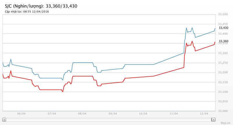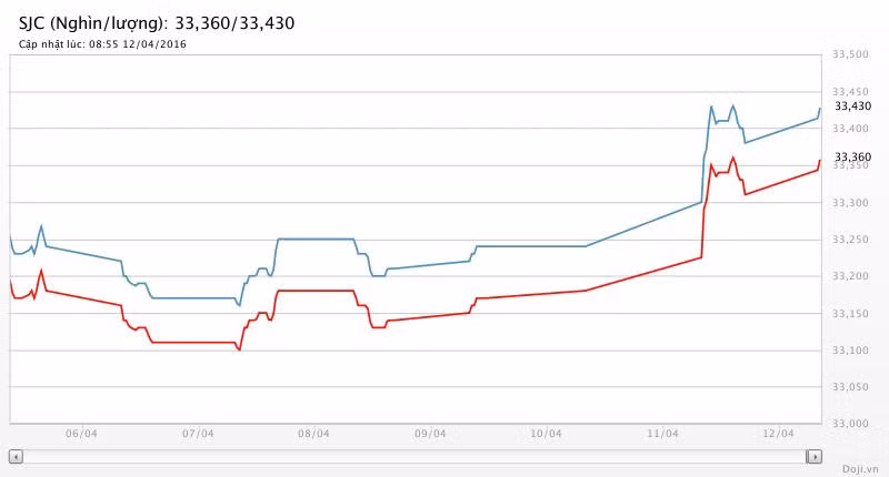 Tương tự, tại các đại lý Doji, giá vàng miếng SJC cũng được Tập đoàn điều chỉnh tăng 50 nghìn đồng lên yết ở 33,36 – 33,43 triệu đồng/lượng (MV-BR) đối với giao dịch lẻ; và đắt hơn 10 nghìn đồng chiều mua, đồng thời rẻ hơn 10 nghìn đồng chiều bán đối với giao dịch buôn ở thị trường Hà Nội. Với biểu giá này, doãng chênh lệch 2 chiều mua – bán vàng SJC tại Doji hiện là 70 nghìn đồng/lượng.