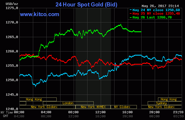 Chốt phiên giao dịch cuối tuần (Thứ Sáu ngày 26/5), giá vàng giao tháng Sáu trên sàn Comex tại Sở Giao dịch New York Mercantile tiếp đà tăng mạnh $11,70 (+0,9%) lên chốt tại $1.268,10/oz, đoạt đỉnh kể từ ngày 28/4, căn cứ theo dữ liệu của FactSet. Tính chung cả tuần, giá kim loại quý này đã tăng 1,2% - cũng là tuần đi lên thứ 3 liên tiếp.