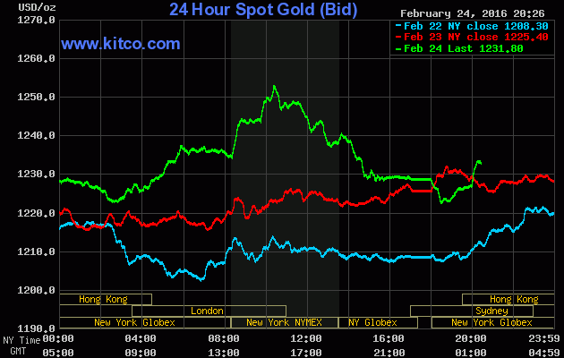Chốt phiên giao dịch Thứ Tư (ngày 24/02), giá vàng giao tháng Tư trên sàn Comex tại Sở giao dịch New York Mercantile tiếp tục bật mạnh $16,50 (+1,4%) lên đóng cửa ở $1.239,10/oz, cao nhất kể từ ngày 12/02.