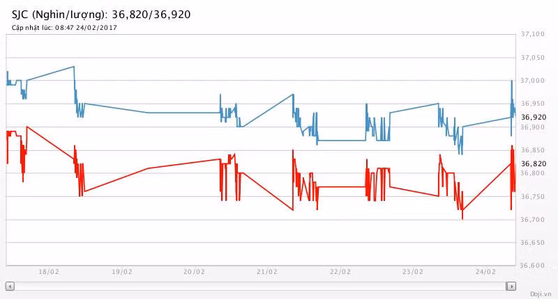 Tương tự, tại các đại lý của Doji, giá vàng miếng SJC cũng được tập đoàn này điều chỉnh tăng 100 nghìn đồng chiều mua và 20 nghìn đồng chiều bán lên yết ở 36,82 – 36,92 triệu đồng/lượng (MV-BR) đối với giao dịch lẻ; và đắt hơn 10 nghìn đồng chiều mua, đồng thời rẻ hơn 10 nghìn đồng chiều bán đối với giao dịch buôn ở thị trường Hà Nội. Theo đó, doãng chênh lệch 2 chiều mua - bán ở Doji đang là 100 nghìn đồng/lượng.
