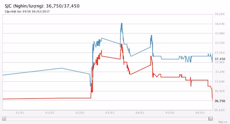 Tương tự, tại các đại lý của Doji, giá vàng miếng SJC cũng được tập đoàn này điều chỉnh giảm mạnh 350 nghìn đồng chiều mua và 50 nghìn đồng chiều bán về yết ở ở 36,75 – 37,45 triệu đồng/lượng (MV-BR) đối với giao dịch lẻ; và đắt hơn 10 nghìn đồng chiều mua, đồng thời rẻ hơn 10 nghìn đồng chiều bán đối với giao dịch buôn ở thị trường Hà Nội. Hiện, doãng chênh lệch 2 chiều mua - bán ở Doji là 300 nghìn đồng/lượng.