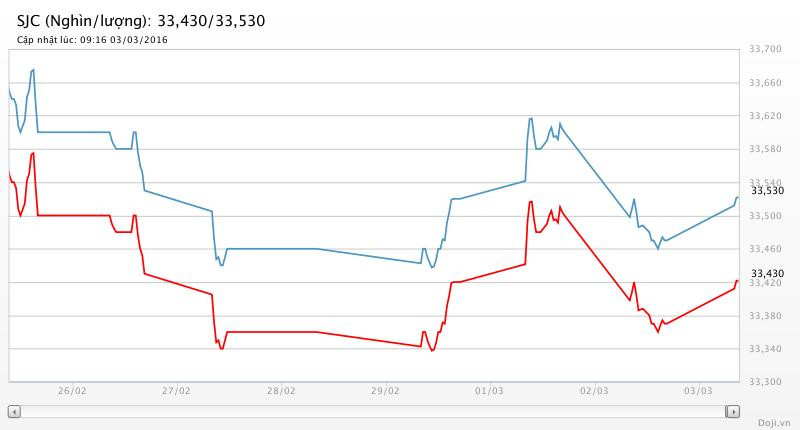 Tương tự, tại các đại lý Doji, giá vàng miếng SJC đã được Tập đoàn điều chỉnh tăng 60 nghìn đồng lên đứng ở 33,43 – 33,53 triệu đồng/lượng (MV-BR) đối với giao dịch lẻ; và đắt hơn 10 nghìn đồng chiều mua, đồng thời rẻ hơn 10 nghìn đồng chiều bán đối với giao dịch buôn ở thị trường Hà Nội. Với biểu giá này, doãng chênh lệch 2 chiều mua – bán vàng SJC tại Doji đang là 100 nghìn đồng/lượng.
