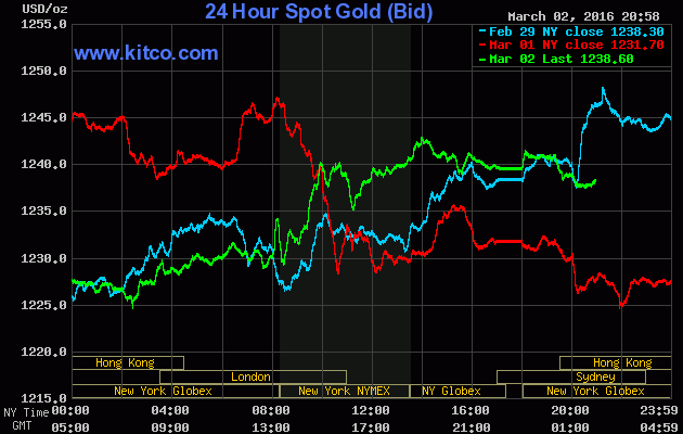 Còn trên phương thức giao dịch điện tử, tính đến thời điểm 8h58 sáng nay, giá vàng giao ngay Comex đang được chào giá ở $1.238,53/oz.