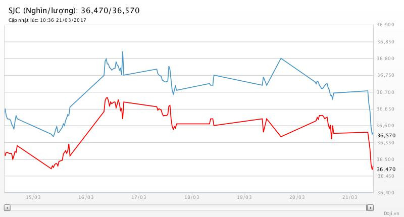 Tương tự, tại các đại lý của Doji, giá vàng miếng SJC cũng được tập đoàn này điều chỉnh giảm mạnh 100 nghìn đồng chiều mua và 120 nghìn đồng chiều bán về yết ở 36,47 – 36,57 triệu đồng/lượng (MV-BR) đối với giao dịch lẻ; và đắt hơn 10 nghìn đồng chiều mua, đồng thời rẻ hơn 10 nghìn đồng chiều bán đối với giao dịch buôn ở thị trường Hà Nội. Như vậy, doãng chênh lệch 2 chiều mua - bán ở Doji đã hiện là 100 nghìn đồng/lượng.