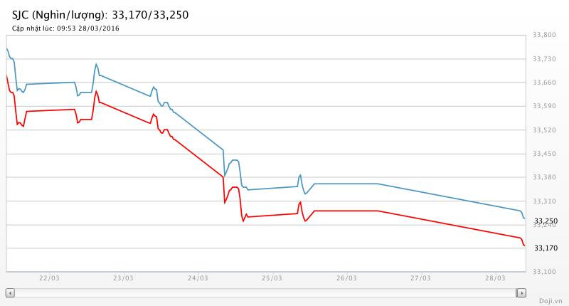 Tương tự, tại các đại lý Doji, giá vàng miếng SJC cũng được Tập đoàn điều chỉnh giảm 110 nghìn đồng mỗi lượng về yết ở 33,17 – 33,25 triệu đồng/lượng (MV-BR) đối với giao dịch lẻ; và đắt hơn 10 nghìn đồng chiều mua, đồng thời rẻ hơn 10 nghìn đồng chiều bán đối với giao dịch buôn ở thị trường Hà Nội. Với biểu giá này, doãng chênh lệch 2 chiều mua – bán vàng SJC tại Doji vẫn là 80 nghìn đồng/lượng.
