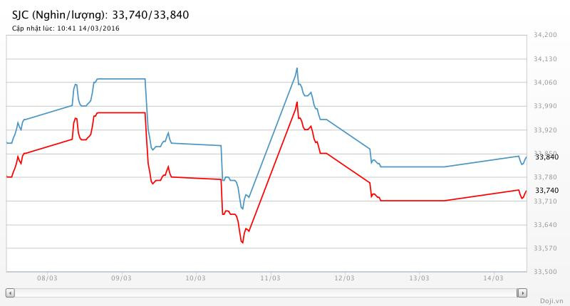 Tương tự, tại các đại lý Doji, giá vàng miếng SJC đã được Tập đoàn điều chỉnh tăng 30 nghìn đồng lên đứng ở 33,74 – 33,84 triệu đồng/lượng (MV-BR) đối với giao dịch lẻ; và đắt hơn 10 nghìn đồng chiều mua, đồng thời rẻ hơn 10 nghìn đồng chiều bán đối với giao dịch buôn ở thị trường Hà Nội. Với biểu giá này, doãng chênh lệch 2 chiều mua – bán vàng SJC tại Doji vẫn là 100 nghìn đồng/lượng.