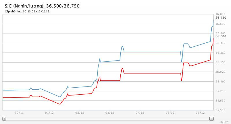 Tương tự, tại các đại lý của Doji, giá vàng miếng SJC lại được Tập đoàn điều chỉnh tăng mạnh 400 nghìn đồng mỗi chiều lên yết ở 36,48 – 36,73 triệu đồng/lượng (MV-BR) đối với giao dịch lẻ; và đắt hơn 10 nghìn đồng chiều mua, đồng thời rẻ hơn 10 nghìn đồng chiều bán đối với giao dịch buôn ở thị trường Hà Nội. Hiện, doãng chênh lệch 2 chiều mua - bán ở Doji là 250 nghìn đồng/lượng.